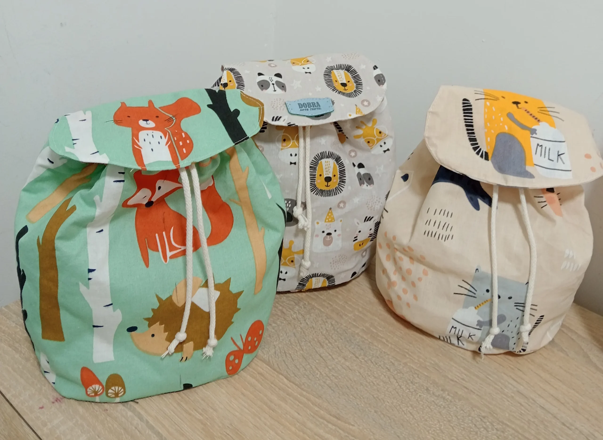 Confeccionada de forma artesanal en nuestro taller, es una mochila ligera, cómoda y fácil de llevar, con tiras adaptadas a su tamaño. Está disponible en distintos estampados, muchos de ellos con animales y motivos infantiles, para que puedas elegir el diseño que más le guste.