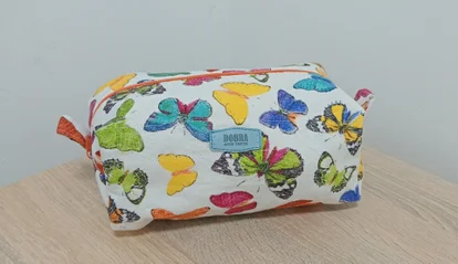 Confeccionado a mano en el taller de Dobra Arte Textil, es ideal para guardar maquillaje, productos de aseo, cepillo de dientes, peine, accesorios o pequeños objetos que quieras tener siempre ordenados. Su forma rectangular permite aprovechar bien el espacio tanto en el baño como en la maleta o en el bolso.
